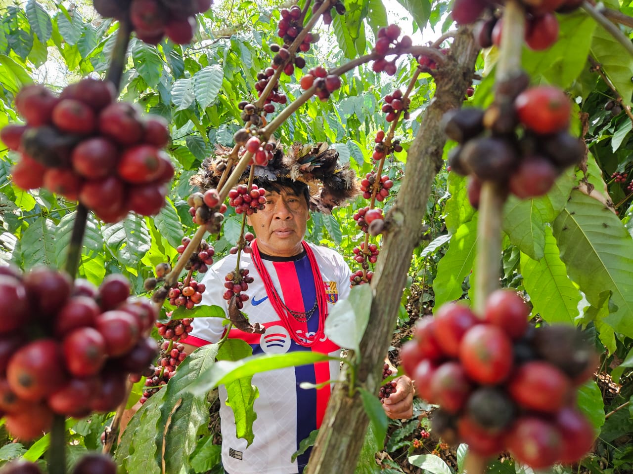 Em 2024, na 6ª edição do concurso Tribos – projeto da 3corações em parceria com Embrapa e instituições como a Funai –, um microlote de Rafael Mopimop Suruí recebeu a inédita nota média de 95 pontos. Cultivado na aldeia Linha 9, na Terra Indígena Sete de Setembro, em Cacoal, o café do cacique já havia figurado entre os melhores em edições anteriores. “Acho que é porque a gente não trabalha com químico”, diz ele, que faz colheita e seleção manual, além de fermentar os frutos, técnica introduzida pela 3corações.
